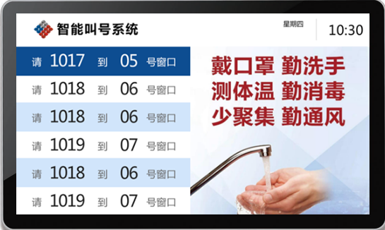 28 寸窗口屏:1920×360 分辨率,分屏显示叫号 + 指引;