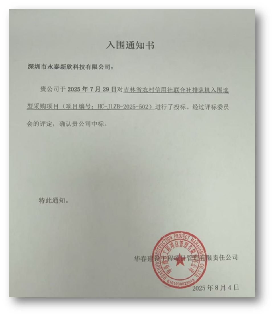 2025年8月4日,吉林省农村信用社联合社排队机入围选型采购项目(项目编号:HC-JLZB-2025-502)中标结果揭晓,深圳市永泰新欣科技有限公司凭借 “全资质合规 + 专利技术驱动 + 高适配参数” 的核心优势,成功入围,为吉林农信网点打造 “稳定可靠、智能高效、安全合规” 的厅堂服务解决方案。